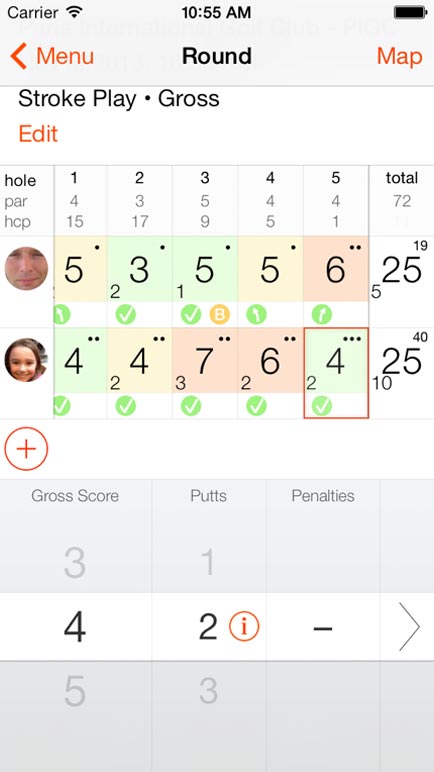 Enter scores, putts, and penalties on a full-size scorecard. Optimized for single-hand input, it is extremely easy to enter all your scores.