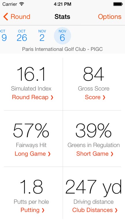 Record each shot and get accurate history of drive accuracy, distance and greens in regulation.